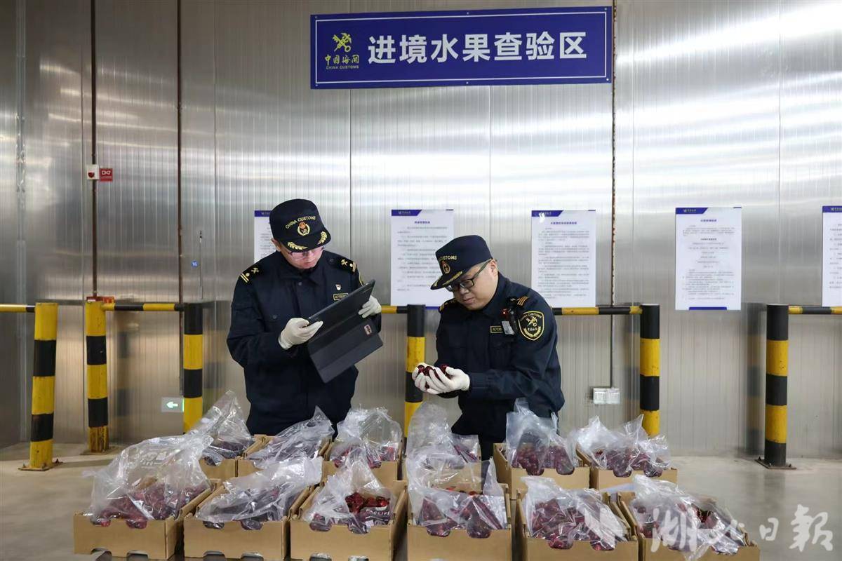 武汉海关关员在鄂州花湖机场查验进口车厘子。